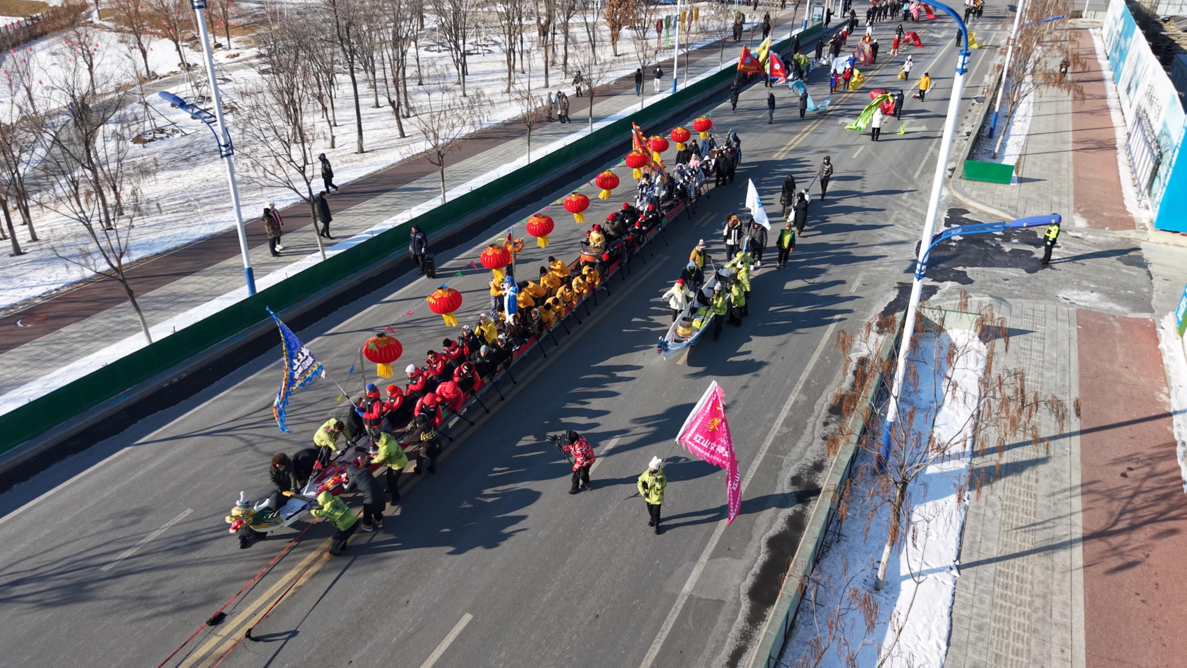 冰雪季的重頭戲——輝南縣第二屆冰上龍舟賽、冰上龍舟超級聯賽在人民公園接連上演,迅速點燃全縣冰雪運動熱情。來自各地的數百名運動員齊聚賽場,他們身著統一隊服,精神抖擻地登上冰上龍舟。隨著裁判員一聲令下,一條條龍舟如離弦之箭沖出起點,運動員們動作整齊劃一,手中的冰釬與冰面猛烈撞擊,濺起陣陣冰花,清脆的撞擊聲與整齊嘹亮的吶喊聲交織在一起,奏響了冬日競技的交響樂。