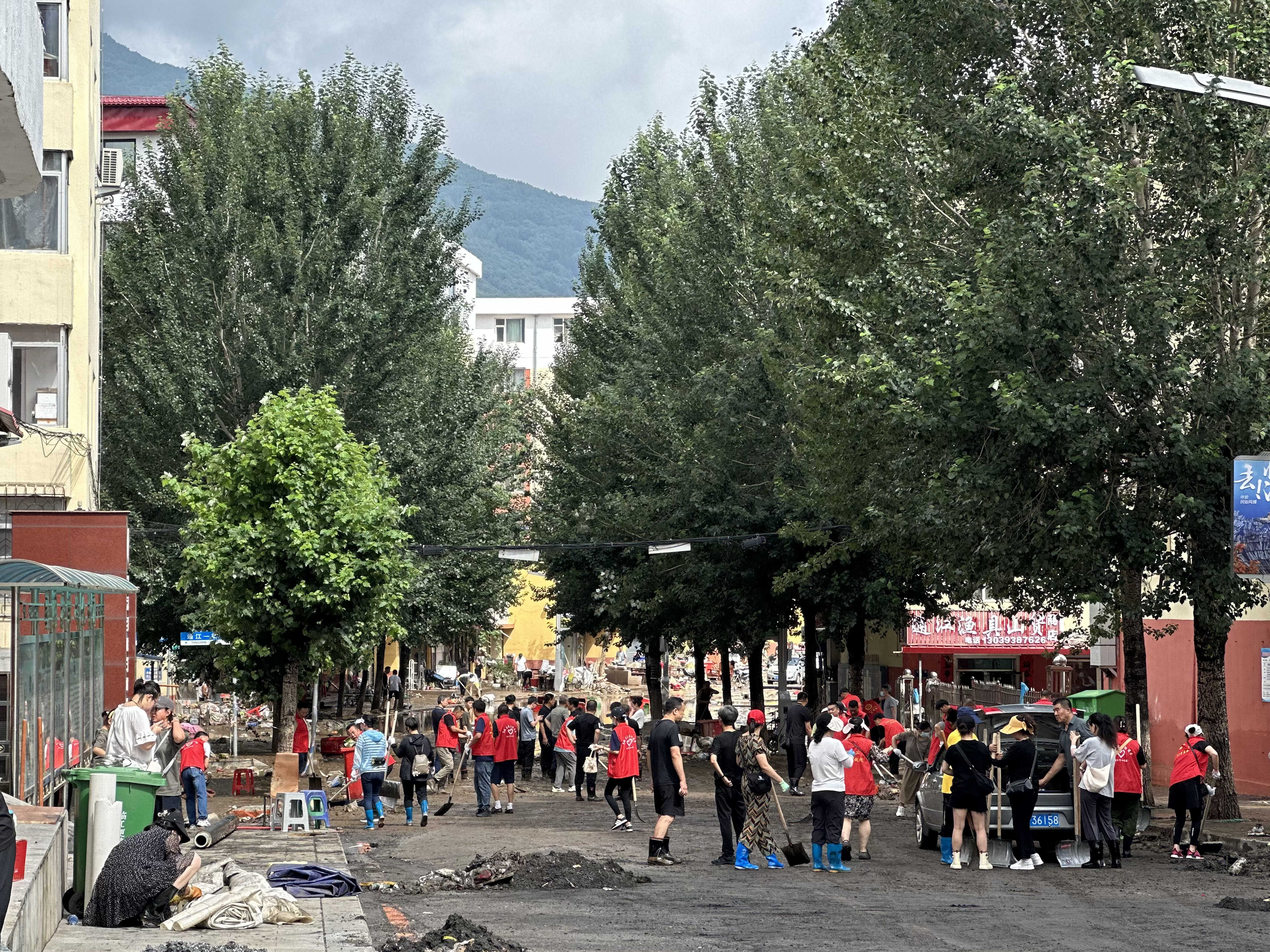 災后清淤 恢復道路暢通 在轄區部分道路可以看到,洪水經過的路面還殘留著不少淤泥,無法通行。建國街道主動作為,集中力量,第一時間組織清淤人員1700余人,對受災區域開展清淤工作。在兩個社區的各個街道上隨處可見志愿者的身影,大家拿著鐵鍬、掃把等清理工具配合鏟車將路面上的淤泥清除,目前街道道路基本恢復暢通。