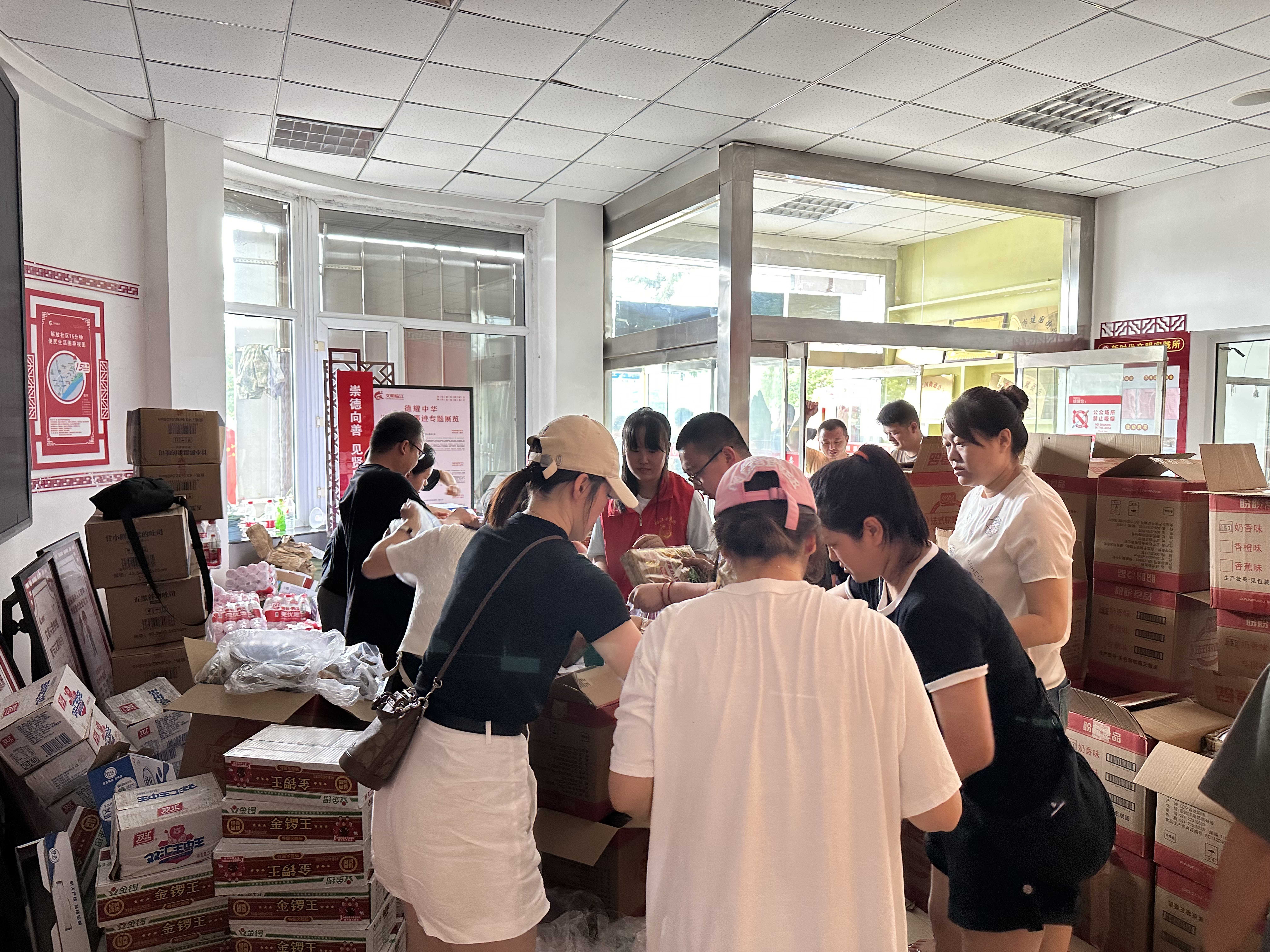 分配物資 保障基本生活 為保障居民的基本生活,建國街道組織30余名街道干部為居民免費配送面包、香腸等食物,并為居民協調飲水。大家自動形成流水線式工作模式,分工協作、默契配合,共裝配食物包3000份送到居民手中。