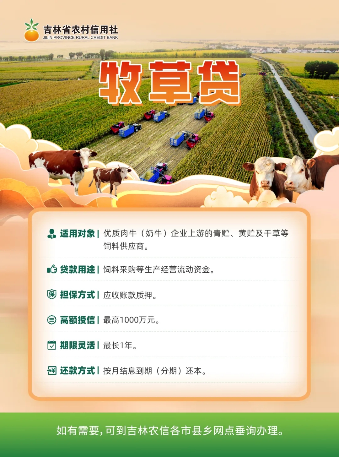 該產品通過“優質核心企業推薦+應收賬款的質押管理”相結合的方式,為省內牧草供應商提供單戶最高不超過1000萬元的貸款額度,最大限度滿足省內牧草供應商融資需求,進一步促進肉牛奶牛產業鏈上下游的緊密合作,助力畜牧業高質量發展。