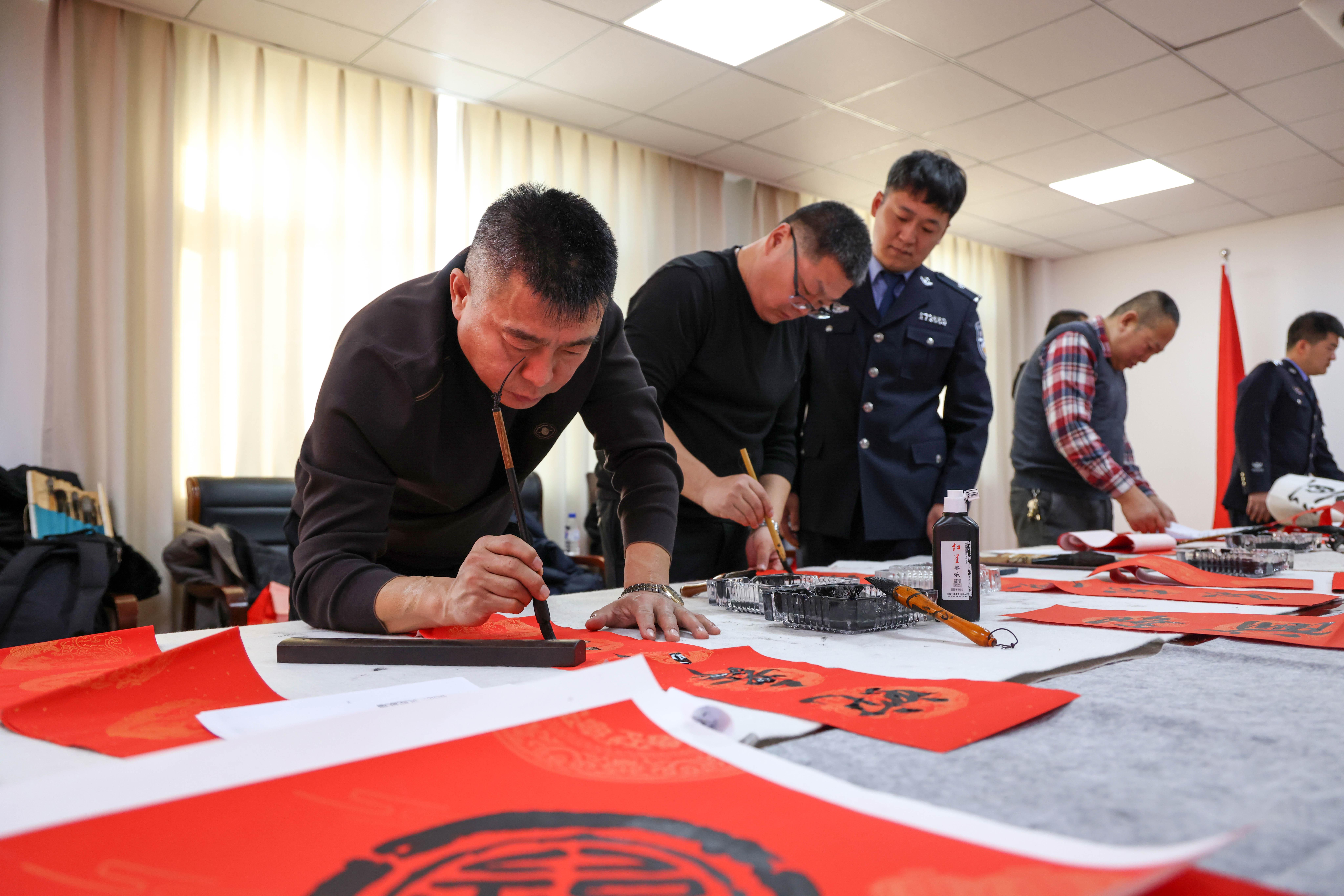 在活動現場,長桌鋪設、毛氈打底、墨香四溢,延邊硬筆書法協會主席王玉寶、龍井書法協會主席劉加英等七名書畫家們即興揮毫潑墨。他們一邊創作,一邊和民警交流,講解書法技巧、解讀春聯文化。民警們認真聆聽觀摩,不時幫忙抻紙遞筆硯墨,現場洋溢著一派歡快、祥和的氣氛。 一上午的時間,書畫家們將對迎新春賀新年的情感傾注于筆端,一副副對聯一蹴而就,一張張福字一氣呵成,一對對象征吉祥如意的春聯一一排開,濃濃年味和溫馨祝福躍然紙上?!袄斡浭姑呅l國展壯志,堅守初心保境安民譜新篇”“移民征途砥礪奮進謀復興,國境哨崗忠誠值守保民安”......這些作品飽含書畫家們對全體民警的崇高的敬意和美好的新春祝福。期間共完成書畫作品200余幅,給即將到來的新春佳節增添了濃厚的年味。 “ 還是手寫的春聯比較有靈氣、更有年味,這字寫得瀟灑自如,真是打動人心?!痹诖郝摃鴮懍F場民警徐琪說。受到現場濃厚氛圍的感染,民警們也紛紛踴躍嘗試。他們拿起毛筆,認真地書寫著,力求用最美的書法、最真誠的心愿,寫下對新年的美好憧憬。