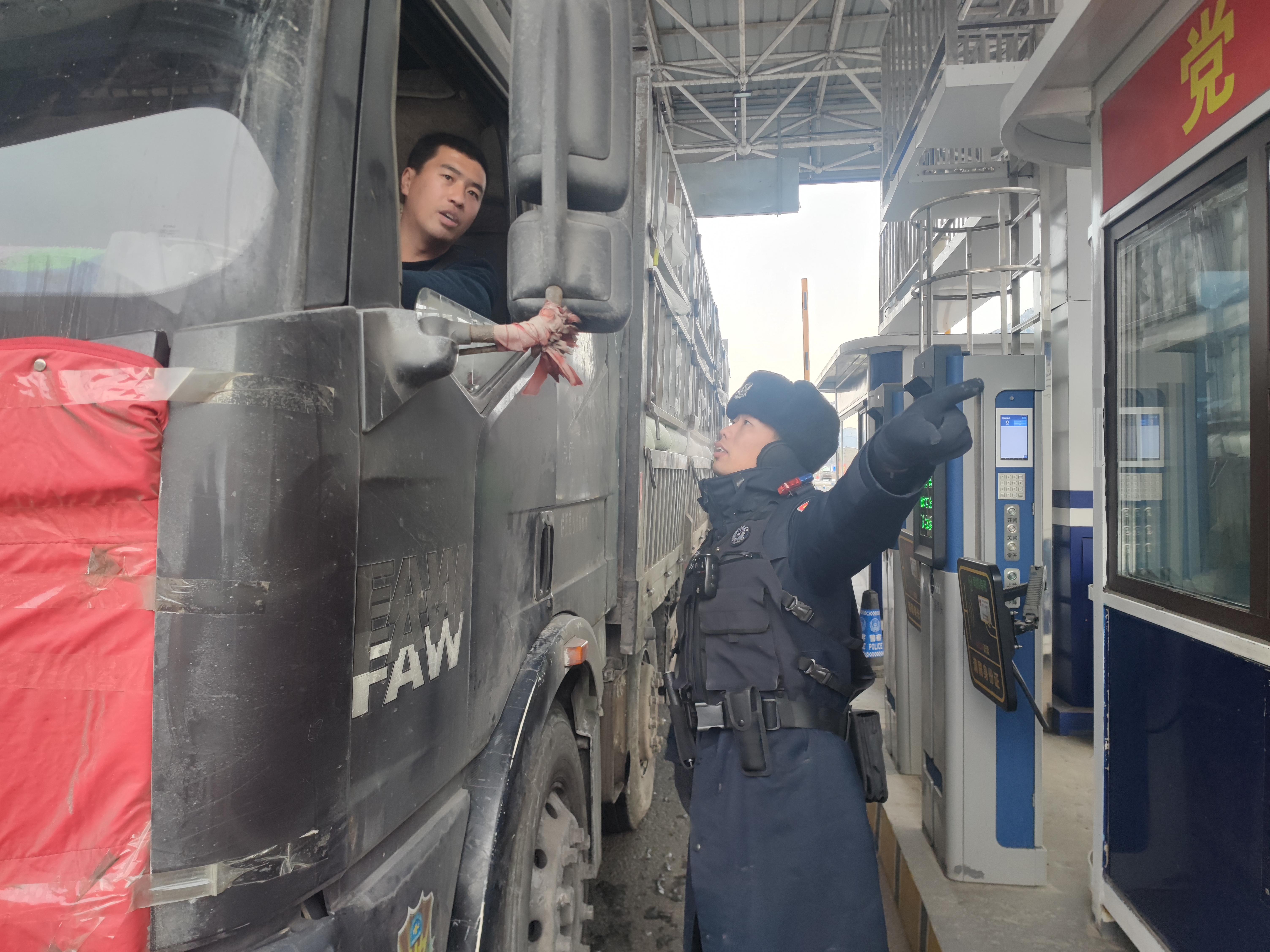 “小伙子,我這過年替別人跑兩趟活,他給我的定位找不到啊。”該站執(zhí)勤民警李袁正在幫助李師傅指引裝貨的路線。