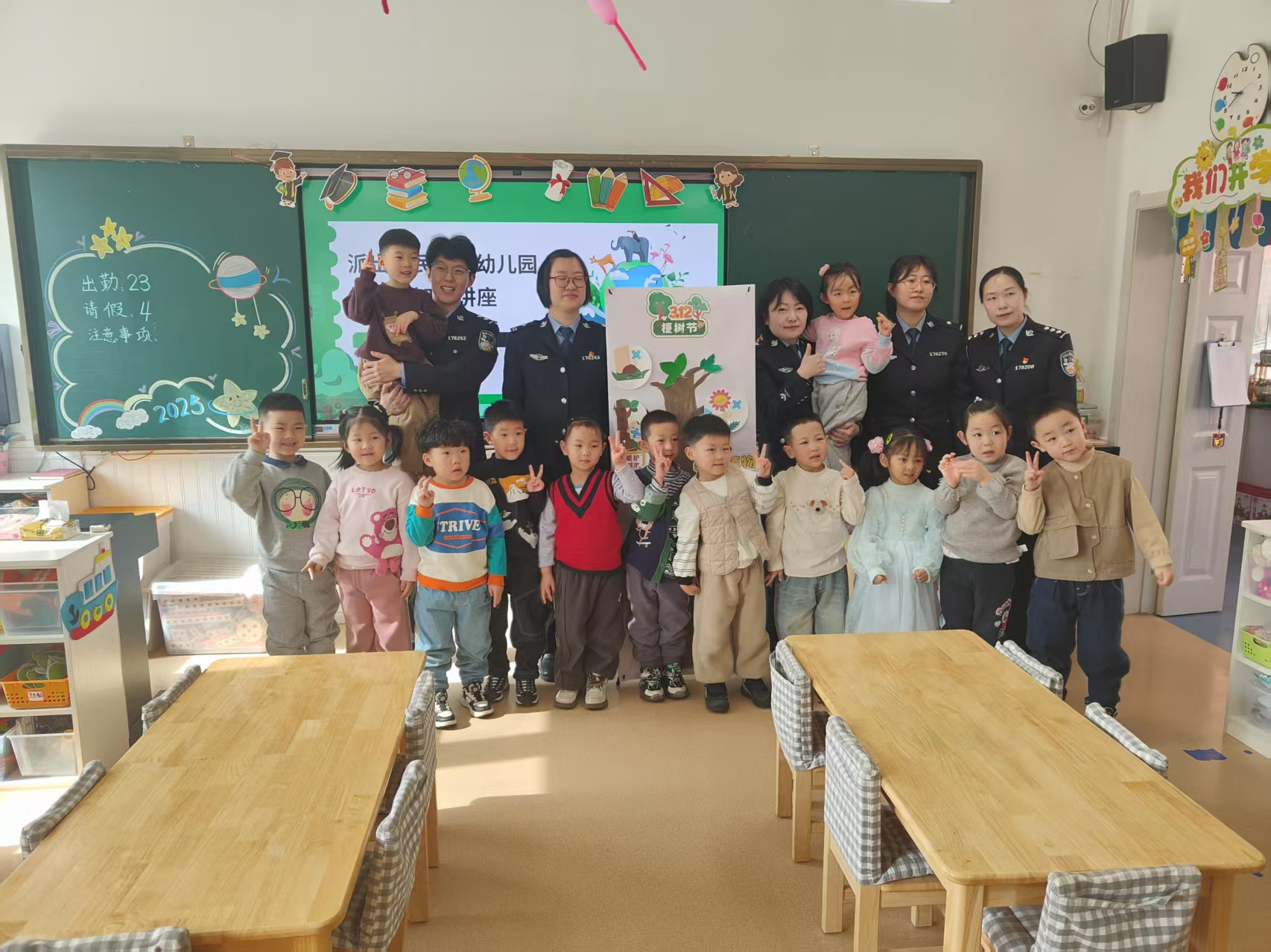 活動(dòng)中,民警根據(jù)幼兒年齡特點(diǎn),通過圖片、視頻、知識問答等多種生動(dòng)的教學(xué)形式,引導(dǎo)幼兒掌握多方面的安全防護(hù)知識。積極宣傳了植樹節(jié)相關(guān)知識及校園安全常識,營造園內(nèi)安全文化氛圍。隨后,民警和小朋友共同在 “安全樹”上貼上照片,讓“安全之樹”在小朋友心中生根發(fā)芽。最后,民警和小朋友們一同升國旗,活動(dòng)在激昂的國歌聲中結(jié)束,此次活動(dòng)給孩子們留下了深刻印象。