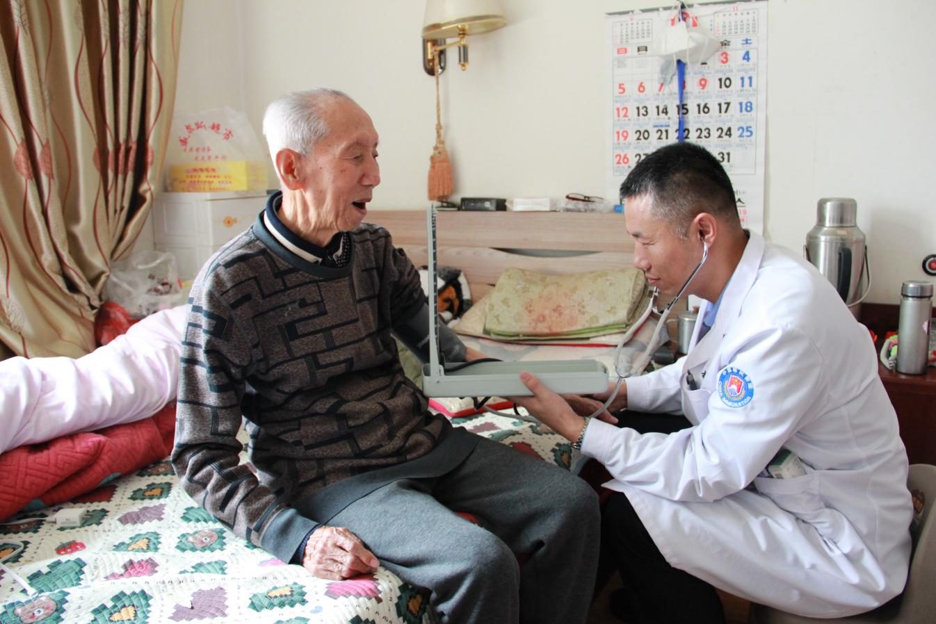 輾轉至轄區敬老院,94歲的抗美援朝老兵鄭宣榮和老伴在家中等著服務隊到來。專家俯下身仔細聽診心臟、測量血壓,又檢查了老人的四肢活動情況。“大爺,您身體底子不錯,天冷了要注意保暖,常用藥記得按時吃。”接過藥品,鄭宣榮老人摩挲著胸前的軍功章,翻出老照片打開了話匣子,興致勃勃地講起赴朝作戰的崢嶸歲月。“感謝你們一直惦記我,還專門來給我檢查身體!”老人的聲音里滿是激動。