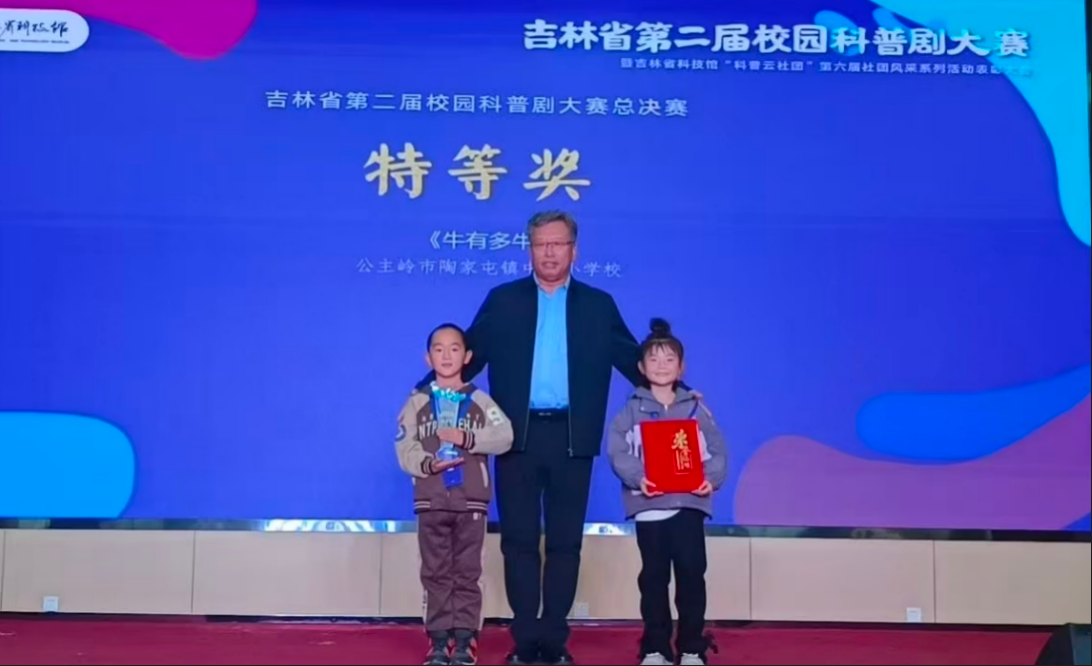 10月26日總決賽中,學(xué)校兩支隊(duì)伍先后登臺(tái)。《Go“兔”月球》以科技為主線,串聯(lián)起人類對(duì)月球的浪漫想象與科學(xué)探索歷程,展現(xiàn)中國(guó)探月工程的輝煌成就,激發(fā)青少年對(duì)航天事業(yè)的興趣與創(chuàng)新意識(shí);《牛有多牛》則通過(guò)“廠長(zhǎng)”“警官”等生動(dòng)角色,將人類與牛在嗅覺細(xì)胞、視野范圍等方面的差異進(jìn)行趣味對(duì)比,使科普知識(shí)通俗易懂。結(jié)尾“中國(guó)牛”的升華,更在孩子們心中悄然播下保家衛(wèi)國(guó)的種子。 經(jīng)激烈角逐,由張艷玲老師指導(dǎo)的《牛有多牛》榮獲大賽特等獎(jiǎng),夏勝南老師指導(dǎo)的《Go“兔”月球》獲二等獎(jiǎng)。張艷玲、夏勝南兩名老師榮獲“優(yōu)秀指導(dǎo)教師”稱號(hào)。 公主嶺市陶家屯鎮(zhèn)中心小學(xué)校校長(zhǎng)劉世英表示,此次參賽不僅是學(xué)校科普教育成果的集中展示,更讓學(xué)生在創(chuàng)作與表演中深化了對(duì)科學(xué)知識(shí)的理解,激發(fā)了探索未知的熱情。學(xué)校將以此次比賽為契機(jī),進(jìn)一步豐富科普活動(dòng)形式,完善青少年科學(xué)素質(zhì)培養(yǎng)機(jī)制,持續(xù)點(diǎn)燃學(xué)生的科學(xué)夢(mèng)想。 |
