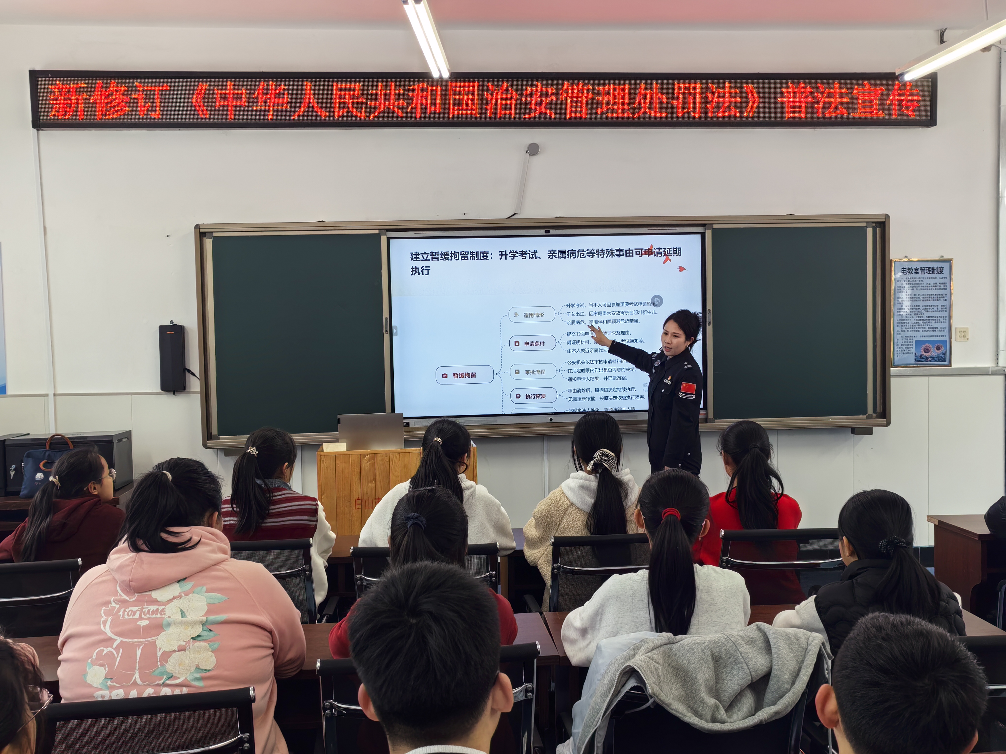為進一步加強青少年法治教育,提升青少年法制意識,筑牢校園安全法治防線。近日,渾江邊境管理大隊組織民警走進白山市渾江區三道溝鎮明德中學,開展新修訂《中華人民共和國治安管理處罰法》專題普法宣傳活動,民警結合學生的年齡特點和認知水平,對新法中與青少年息息相關的內容進行了重點解讀。