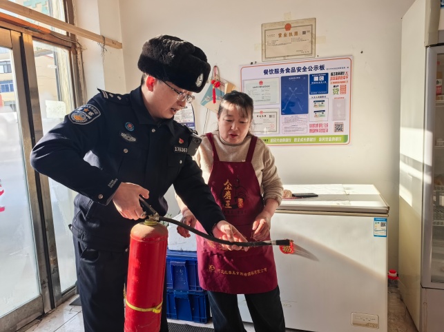 春節(jié)臨近,為保障群眾生命財(cái)產(chǎn)安全,營(yíng)造平安祥和的節(jié)日氛圍,白山邊境管理支隊(duì)大栗子邊境派出所緊密結(jié)合歲末年初治安特點(diǎn),組織警力對(duì)轄區(qū)小商店、小餐飲、小旅館等“九小場(chǎng)所”開展拉網(wǎng)式安全隱患排查整治,通過“監(jiān)督+提醒”“檢查+服務(wù)”模式,嚴(yán)密筑牢節(jié)日安全防線。 1月21日上午,民警深入各場(chǎng)所,聚焦消防設(shè)施配備、疏散通道暢通、用火用電用氣安全、監(jiān)控設(shè)備運(yùn)行等關(guān)鍵環(huán)節(jié),進(jìn)行逐戶走訪、逐項(xiàng)檢查。在某小吃店,民警發(fā)現(xiàn)滅火器壓力指示已至紅區(qū),立即督促店主盡快聯(lián)系專業(yè)機(jī)構(gòu)充裝更換,強(qiáng)調(diào)“過期的器材關(guān)鍵時(shí)刻用不上”。在一家飯店后廚,民警現(xiàn)場(chǎng)督促清理了遮擋滅火器的雜物,并演示“提拔握壓”操作要領(lǐng),叮囑經(jīng)營(yíng)者節(jié)日客流增多更須緊繃安全弦。
