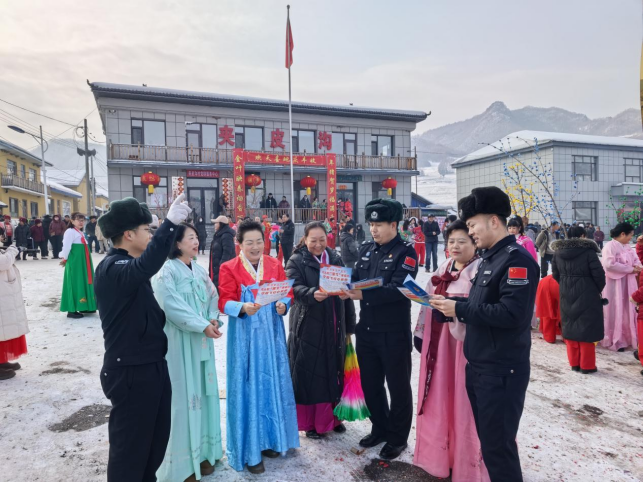 這邊剛把冒著熱氣的殺豬菜端上桌,那邊的大秧歌就扭起來了,民警們也被熱情的村民拉進隊伍,民警和村民共同組成的秧歌隊踩著鼓點扭了起來。秧歌表演結束后,“流動普法小課堂”隨即開講,民警們用通俗易懂的語言,向現場群眾講解《中華人民共和國治安管理處罰法》和《吉林省邊境管理條例》等法律法規,并針對邊境地區常見的矛盾糾紛、消防安全等問題進行答疑解惑,現場發放宣傳資料200余份,解答群眾咨詢30余人次。
