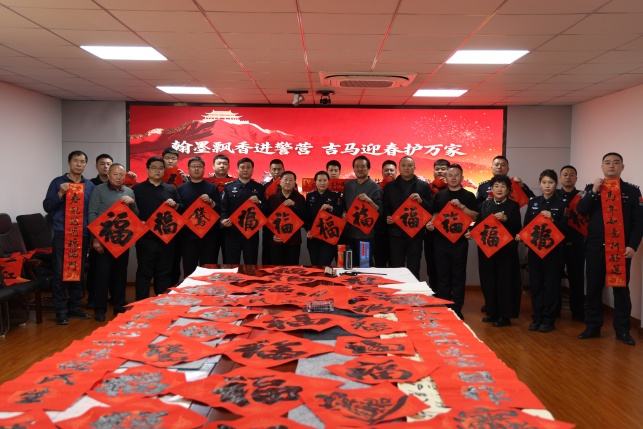 活動現場墨香氤氳、暖意融融,案幾上筆墨紙硯擺放整齊、一應俱全。三位書法名家凝神聚氣、落筆沉穩,或筆走龍蛇、氣勢雄渾,或行云流水、雅致雋秀,將深厚的筆墨底蘊與對新春的美好期許凝于筆端、落于紙上。片刻之間,一幅幅字跡工整、寓意吉祥的“福”字錯落鋪展,一副副融合丙午馬年喜慶意蘊與移民管理使命擔當的春聯躍然紙上。“三尺驗證臺系萬家燈火 五更巡邏守一方安寧”等佳作,既飽含新春美好愿景,更彰顯了移民管理隊伍忠誠履職、守衛國門的責任擔當。警營書法愛好者們也不時向書法名家們請教筆法技巧,從握筆姿勢到運筆力度,從結構布局到意境營造,在細致交流中感悟書法藝術的魅力,在筆墨切磋中深化職業使命認同。