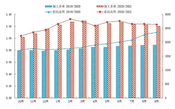 2020/2021年度吉林省玉米市場價格走勢圖 影響玉米生產、市場因素 (一)持續降雨,局地秋澇,收割難度加大 9月末至10月初,我省出現連續降雨天氣,導致榆樹、梅河等局部低洼農田積水漬澇,土壤過濕過軟,剛開始收割時,輪式收割機進不去,履帶式收割機的數量相對較少,收割機作業難度加大。10月中下旬天氣晴好,土壤快速降濕,農民才開始大面積收割。對于收割機數量較少的地方,農戶需排隊等候收割機作業時間,由于延后時間相對較長,導致秸稈過于干燥,后期部分地塊秸稈出現折斷現象,影響收割速度。 (二)收割期延后,市場啟動偏晚,購銷主體觀望居多 受天氣影響,玉米收割期延后,10月末新玉米才零星上市,交易清淡,直至目前尚未進入大量上市階段,市場啟動整體偏晚,新玉米區域性供應偏緊的局面可能會持續一段時間。由于玉米價格跌至本年度最低水平,大部分農民想等等行情再說,從調查的情況看,多數農民想元旦或春節前后出售。貿易商和糧商觀望氛圍濃厚,詢價較少,收購謹慎。11月8-10日,全省大范圍出現強降雪天氣,道路濕滑,交通受阻,再次推動市場活躍期延后。 (三)農民擔心化肥價格繼續上漲,期盼玉米價格再高些 化肥等生產資料價格自春耕期間開始上漲,玉米的生產資料直接投入明顯增加。隨著原材料價格和電價的上漲,夏季化肥價格繼續攀升。據農戶介紹,尿素去年價格為90-100元/袋,今年夏季追肥時已漲到150-170元/袋,由于化肥價格一直居高不下,生產資料經銷商不敢貿然存貨,社會庫存處于相對低位,從意向定購的情況來看,明年化肥價格上漲的可能性要大一些。因此,農民希望玉米價格能再高一些,以彌補生產資料價格的上漲。 幾點建議 (一)構建新型農機社會化服務體系 我省主要農作物耕種收綜合機械化水平已達到90%左右,但也存在區域間發展不平衡問題和不同農戶間分散經營、各自為戰的情況。建議建立以農機供應維修、聯合作業和租賃服務為主要內容,覆蓋全程、運轉高效、綜合配套的新型農機社會化服務體系。引導農機社會化服務組織從單一的農機作業服務向農資采購、生產托管、全程機械化作業、糧食倉儲烘干、加工與銷售等全產業鏈環節服務延伸,并鼓勵其開展跨區聯合作業。 (二)積極引導多元主體入市收購玉米 當前,糧食市場形勢錯綜復雜,不確定因素增多。各地要采取有效措施,積極引導多元主體入市收購,在區域性、階段性農民“賣糧難”時段,鼓勵收購主體多收快銷,多收快用。實現鐵路、公路、水路運力與運輸需求對接,積極推廣物聯技術和大數據信息技術在收糧流程、糧質檢測等方面的應用,千方百計提高流通效率,降低流通成本。 (三)鼓勵農資經銷商組建農資配送服務聯盟 鼓勵農資經銷商在合作社、家庭農場等規模經營場所組建農資配送服務聯盟基地,并開展農資廠家直供活動,使得農資質量有保障、價格有優勢,減少流通環節,促進上門服務,實時對接服務與需求,擴大服務輻射范圍,逐步讓利于民、方便于民。 |