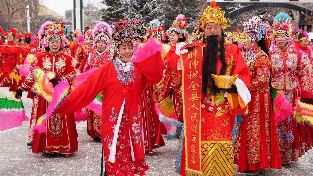 安口鎮秧歌隊領隊介紹說:“此次安口鎮秧歌隊,在全鎮17個行政村中選拔出了66名隊員,通過特色秧歌、特色高蹺以及喜劇人物展示等形式,恭祝全縣人民新春大吉、元宵節快樂。”