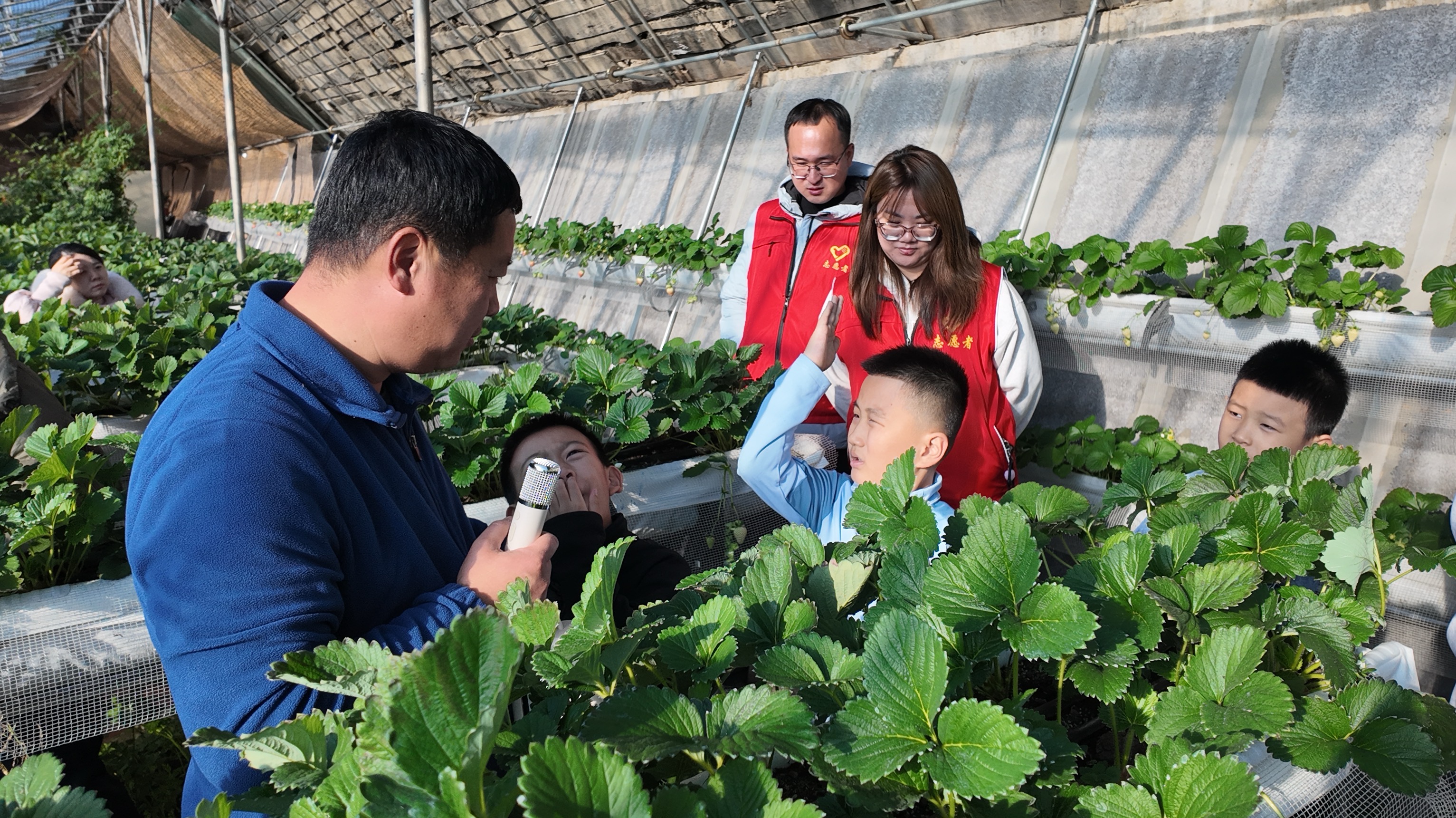在溫暖如春的溫室大棚內(nèi),負(fù)責(zé)人馬亮向?qū)W生們講解了溫室草莓的種植技術(shù)與科學(xué)管理要點,并結(jié)合棚膜結(jié)構(gòu)、溫控系統(tǒng)等內(nèi)容,生動闡釋了現(xiàn)代農(nóng)業(yè)技術(shù)的應(yīng)用原理。孩子們認(rèn)真聆聽,積極提問,對“冬天里的草莓園”充滿了好奇。隨后,學(xué)生們在工作人員指導(dǎo)下親身參與草莓采摘勞作,學(xué)習(xí)農(nóng)事操作技巧,在體驗采摘樂趣的同時,深刻體會到勞動的艱辛與收獲的喜悅。