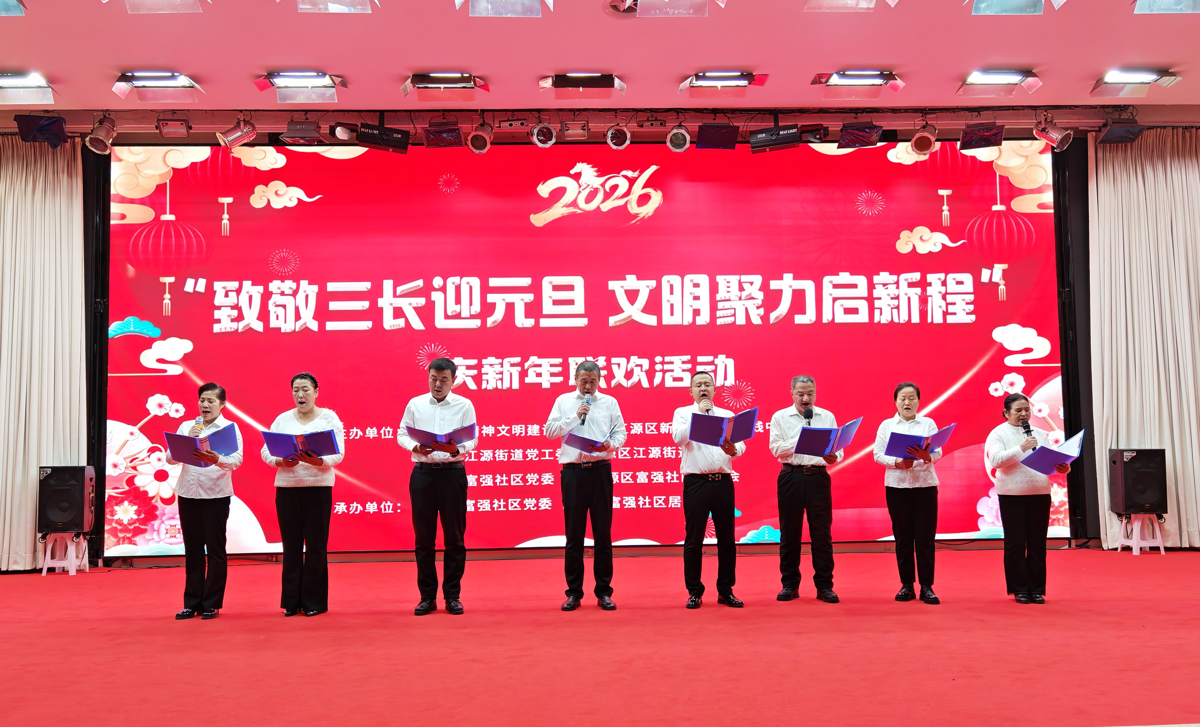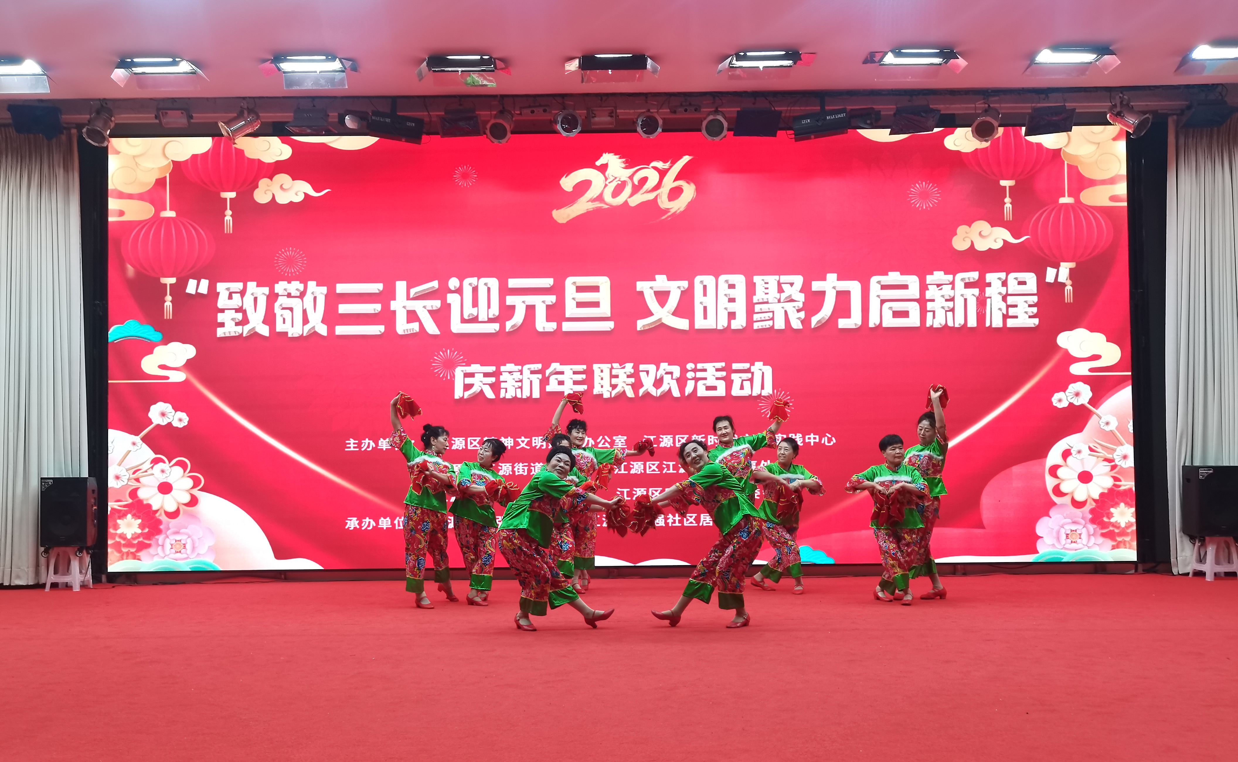 為深切致敬基層治理一線的中堅力量,進一步凝聚全區上下文明向善的強大合力,營造歡樂祥和的節日氛圍,近日,由白山市江源區精神文明建設辦公室、江源區新時代文明實踐中心主辦的“致敬‘三長’迎元旦 文明聚力啟新程”慶新年聯歡文明惠民活動在青少年宮禮堂溫情啟幕。社區黨員代表、“三長”(網格長、樓棟長、單元長)代表、文藝志愿者及轄區熱心居民齊聚一堂,載歌載舞共慶元旦佳節,共話家園發展新愿景。 活動現場暖意融融,鮮艷的氣球與喜慶的燈籠點綴其間,空氣中洋溢著濃厚的節日氣息。伴隨著歡快激昂的旋律,開場舞《福門開好運來》率先登場,舞者們身著艷麗服飾,邁著輕快的舞步,用靈動的舞姿傳遞出對新年的美好期盼,瞬間點燃了現場的熱烈氛圍,正式拉開了“全民聯歡”的序幕。