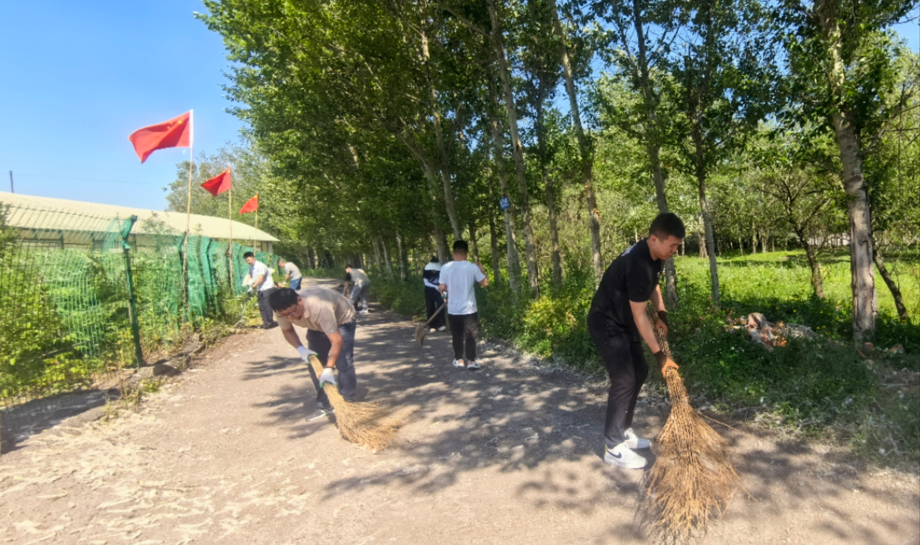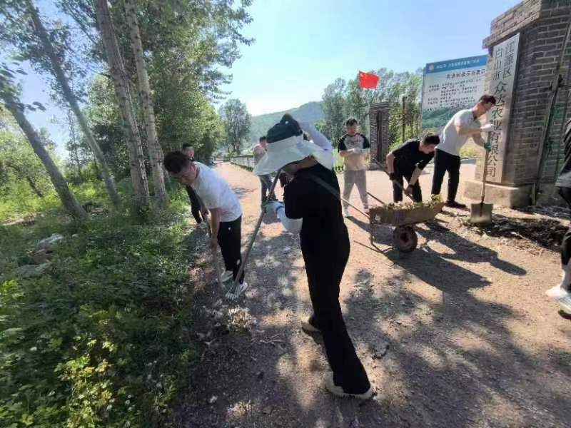 道路兩側雜草叢生,飄落的柳絮密密麻麻很難清除。大家分工協作、默契配合,在室外30多度的高溫下,對2000米的道路兩側雜草、樹枝、柳絮進行徹底清理。汗水順著臉頰流淌,濕透了衣襟,泥土沾滿了褲腳,形成了一道靚麗的風景線。